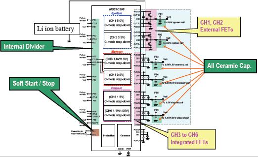 作為首個單芯片集成化的電源管理LSI,該產(chǎn)品滿足了由英特爾提出的新的LPIA(Low Power Intel Architecture,英特爾低功率架構(gòu)計劃平臺的各項供電規(guī)格要求。MB39C308擁有6通道DC/DC轉(zhuǎn)換器(1)控制電路在滿足了新的LPIA平臺對電源系統(tǒng)的要求。同時由于集成了其他的外圍元件在同一芯片上,,其電源管理系統(tǒng)的方案體積能夠減少到其他公司同類產(chǎn)品的三分之一以下。并且該LSI產(chǎn)品可提高電池的供電效率,有助于延長UMPC電池的運行時間。