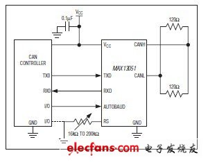 The MAX13051 ±80V fault-protected CAN transceiverwith autobaud is ideal for device net and other industrialnetwork applications where overvoltage protection isrequired. The MAX13051 provides a link between theCAN protocol controller and the physical wires of thebus lines in a control area network (CAN).