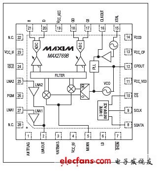MAX2769B采用Maxim先進的低功耗SiGe BiCMOS工藝,能夠以較低的成本提供業(yè)界最高的性能和集成度。單芯片內(nèi)集成了完整的接收鏈路,包括雙輸入LNA、混頻器、鏡頻抑制濾波器、PGA、VCO、N分頻頻率合成器、晶體振蕩器和多位ADC。該接收器的總噪聲系數(shù)低至1.4dB。MAX2769B集成了單芯片濾波器,無需外部IF濾波器,僅需少量外部元件即可構(gòu)建完整的低成本GPS RF接收機方案。MAX2769B是目前設(shè)計最為靈活的一款接收機。片內(nèi)Σ-ΔN分頻合成器可以在主機系統(tǒng)所提供的任意參考頻率或晶振頻率下,以±30Hz (fXTAL = 32MHz)的精度設(shè)置IF頻率。ADC可以同時為I和Q通道各輸出一位或兩位量化值的CMOS邏輯電平,或者為I通道輸出三位量化值的CMOS邏輯電平。也可以提供I和Q通道的模擬輸出。MAX2769B采用帶裸焊盤的5mm x 5mm、28引腳薄型QFN封裝。