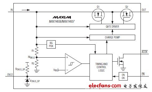 MAX14606/MAX14607過(guò)壓保護(hù)器具有導(dǎo)通電阻(RON)低至54mΩ (典型值)的內(nèi)部FET,為低壓系統(tǒng)提供高達(dá)+36V的故障保護(hù)。當(dāng)輸入電壓超出過(guò)壓門(mén)限時(shí),內(nèi)部FET關(guān)斷,以避免損壞受保護(hù)元件。器件可自動(dòng)選擇精確的內(nèi)部過(guò)壓故障觸發(fā)門(mén)限,內(nèi)部OVLO預(yù)設(shè)為典型值5.87V (MAX14606)或6.8V (MAX14607)。MAX14606/MAX14607具有反偏保護(hù)功能。與其它過(guò)壓保護(hù)器不同,當(dāng)MAX14606/MAX14607關(guān)斷時(shí),作用在OUT的電壓不會(huì)反饋到IN端。這些器件還具有熱關(guān)斷保護(hù),防止過(guò)流。MAX14606/MAX14607工作在-40°C至+85°C擴(kuò)展級(jí)溫度范圍,采用9焊球WLP封裝。