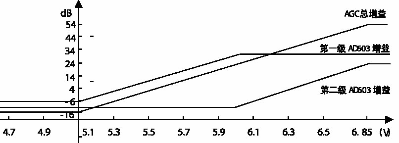在無信號輸入時,調(diào)整9018的靜態(tài)工作點,使9018發(fā)射極的PN結(jié)處于近似截止?fàn)顟B(tài),并調(diào)整R7的阻值使得VAGC為6.85V,此時兩級AD603的增益全部放開,即54dB;當(dāng)有信號輸入,但其信號強度尚不能使9018發(fā)射極的PN結(jié)導(dǎo)通時,AGC處于失控狀態(tài),輸出信號將隨著輸入信號強度的增大而增大;當(dāng)信號強度足以使9018發(fā)射極的PN結(jié)導(dǎo)通時,9018處于AGC檢波狀態(tài),此時AGC開始起控,VAGC大約以25mV/dB的速率下降,直至下降到5.1V。對應(yīng)的兩級AD603的增益也開始逐漸從54dB下降到-16dB,先是第二級AD603的增益逐漸從24dB下降到-10dB,然后第一級AD603的增益也開始逐漸從30dB下降到-6dB。此時,AGC進入飽和點,輸入信號強度再增大時,AGC已失去控制作用,輸出信號又將隨著輸入信號強度的增大而增大。這就是AGC的整個控制過程,即隨著輸入信號強度的不斷增大,AGC將歷經(jīng)失控、開始起控、進入飽和、再次失控的控制過程。