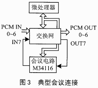 M34116是專為PCM數(shù)字交換應用而設計的器件,能匯接64方會議和最多29組會議。M34116與交換網(wǎng)絡、微處理器連接中圖3所法。交換網(wǎng)可以采用M3488或MT8980D等數(shù)字交換網(wǎng)絡。經(jīng)過PCM編碼后,其輸出時隙比輸入時隙延時一個幀(加一個時隙),因此,做會議接續(xù)時應延時一個時隙。輸入、輸出關系如圖4所示。M34116對每種工作模式的每一通道具有可編程衰減 或增益控制,輸入/輸出的范圍均為±15dB。