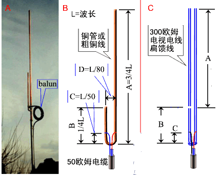 雙線J極子天線有容易制作、便于攜帶、便于隱藏等特點。以下詳細(xì)介紹其制作步驟:計算真空波長:L=300/f 米,其中f是發(fā)射頻率(兆赫) 計算長度A、B、C:A=0.5*0.94*L,B=0.25