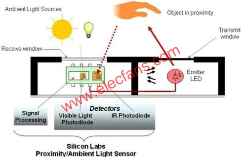 長時間高電流保護、陽光和環(huán)境光源消除等問題,確保光學接近式傳感器的穩(wěn)固性和性能?! 》瓷湫凸鈱W接近式傳感器介紹和工作原理 光學接近式傳感器基本上是由紅外LED發(fā)射器和PIN光檢測器所組成,圖1為典型接近