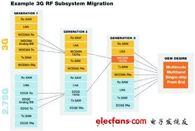 能夠支持更多頻段和精簡射頻架構(gòu)的手機上,將3G手機中使用的GSM、EDGE、WCDMA和HSPA等多種頻段和空中接口模塊整合在一個高度集成、經(jīng)過優(yōu)化的RF模塊中。對RF芯片技術(shù)的不斷完善與升級已經(jīng)成為