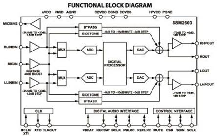 概述:SSM2603采用28引腳、5mm×5mm引腳架構(gòu)芯片級封裝(LFCSP),配有一組立體聲可編程增益放大器(PGA)線路輸入和一個(gè)單聲道麥克風(fēng)輸入,適合便攜式數(shù)字音頻應(yīng)用。