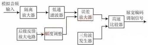 輸入的模擬音頻信號首先經隔離放大器進行放大,再與反饋回來的音頻信號一起送到誤差放大器,輸出放大的誤差音頻信號。將放大的誤差信號和載波信號送到脈寬調制器,進行NBDD 調制。載波信號是由三角波發(fā)生器產生的高線性度的模擬三角波信號,頻率為230~ 280 kHz。