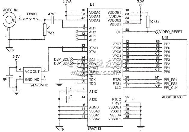圖2為H.264編碼系統(tǒng)的視頻輸入模塊。7113芯片從視頻端子讀入攝像頭輸出的模擬信號,通過并口將數(shù)字信號輸出給Blackfin533。Blackfin533通過I2C總線對7113進行配置,使其輸出YUV模式、ITU656模式及增強ITU656模式等。