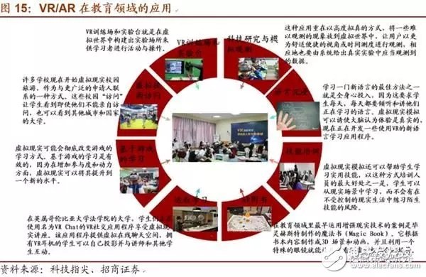 具體到應(yīng)用場景,例如在視頻游戲行業(yè),VR/AR將應(yīng)用到3D游戲、人機(jī)對戰(zhàn)、觀看虛擬現(xiàn)實(shí)影片等方面;在房地產(chǎn)行業(yè),VR/AR將應(yīng)用到可視化互動(dòng)體驗(yàn)、樣板間展示、城市規(guī)劃、科技園區(qū)等方面;在醫(yī)療行業(yè),VR/AR將應(yīng)用到手術(shù)培訓(xùn)、治療疼痛、病人教育、戒煙甚至牙醫(yī)等方面;在教育培訓(xùn)行業(yè),VR/AR在語言沉浸、遠(yuǎn)程學(xué)習(xí)、虛擬校園訪問、技能培訓(xùn)等方面等方面有所應(yīng)用。