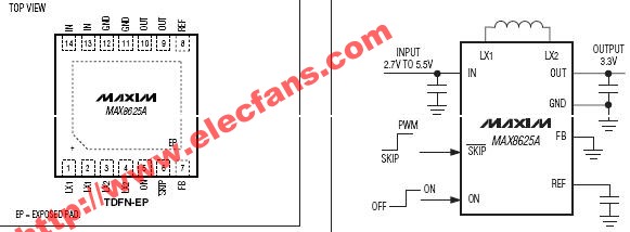 圖 1. MAX1556 降壓轉(zhuǎn)換器集成了低導(dǎo)通電阻的 MOSFET,采用同步整流,可以達(dá)到 95%的轉(zhuǎn)換效率,效率曲線(xiàn)如圖所示。降壓型 SMPS