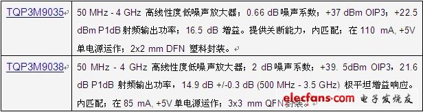特點TQP3M9036具有高線性度、超低噪聲增益塊放大器,采用2x2mm的小型表面安裝封裝。在900 MHz時,放大器通常提供19.8 dB的高功率增益、+36 dBm OIP3和0.45 dB