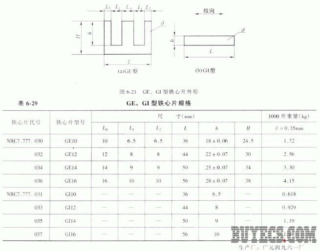 GE 、Gl 型鐵心片的外形如圖6-21 所示,其規(guī)格見表6-29。