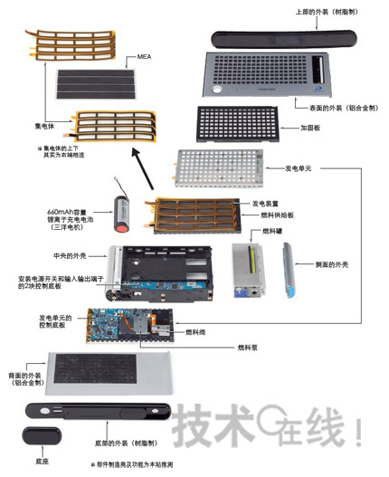 發(fā)電單元是把發(fā)電裝置安放在格子狀不銹鋼板和作為燃料供給板的樹脂外殼之間。不銹鋼板與燃料供給板因是用鉚釘固定的,所以不打破則無法取出發(fā)電裝置。