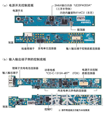 除此之外,電源開關(guān)底板上還安裝了2Mbit閃存,被認為是用于記錄充電時間和溫度變化。鋰離子充電電池與輸入輸出端子控制底板連接,為該底板提供驅(qū)動發(fā)電單元電路的電力。