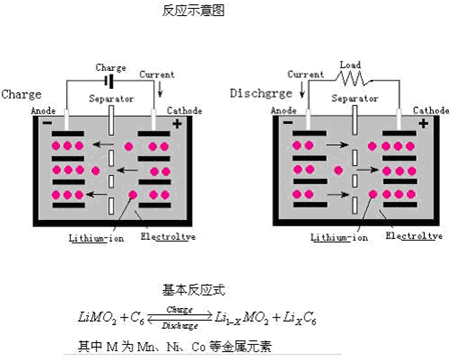 鋰離子電池的正負極活性物質(zhì)均為嵌入化合物,充電時Li+從正極脫出,經(jīng)過電解質(zhì)插入到負極;放電時則相反,電池的充放電過程實際上是Li+在兩個電極之間來回嵌入和脫出的過程,故這種電池又稱為“搖椅電池”(Rocking Chair Batteries,縮寫為RCB)。其反應示意圖及基本反應式如下所示: