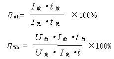 在正常使用的條件下,鎳鎘電池的容量效率ηAh為67%-75%,電能效率ηWh為55%~65%,循環(huán)壽命約為2000次。容量效率ηAh和電能效率ηWh計(jì)算公式如下: