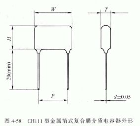 CH111型金屬箔式復(fù)合膜介質(zhì)電容器采用復(fù)合膜介質(zhì),以鋁箔為電極卷繞而成,用環(huán)氧樹脂浸涂包封,具有電容量穩(wěn)定、溫度系數(shù)小的特點,適用于電子設(shè)備中要求容量變化小的直流或脈動電路。其外形如圖458所示,主要特性參數(shù)見表4-92 和表4-93 。