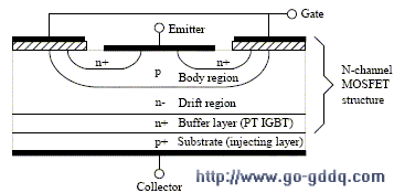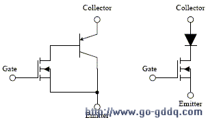 ?? 一個N溝道IGBT基本上是一個N溝道功率MOSFET構(gòu)建在p型襯底上,圖1為通常的IGBT橫截面。(PT IGBT有一個額外的N+層,并將加以解釋。)因此,使用IGBT和使用功率MOSFET非常相似。從發(fā)射極到柵極之間加一個正的電壓,使得電子從Body流向柵極。 如果門-發(fā)射極電壓達(dá)到或超過所謂的閾值電壓,足夠多的電子流向柵極跨過Body形成一個導(dǎo)電通道,允許電流從集電極流向發(fā)射極。(準(zhǔn)確地說,它使得電子從發(fā)射極流向集電極。)這種電子流吸引陽離子或空穴從p型襯底經(jīng)漂移區(qū)到達(dá)集電極。如圖2所示,為IGBT的簡化等效電路圖。