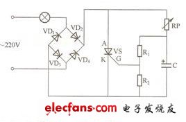 圖4所示是一個(gè)簡單實(shí)用的調(diào)光臺燈電路。調(diào)節(jié)RP的阻值,可改變電容C充電達(dá)到UG值得時(shí)間,即調(diào)整晶閘管的導(dǎo)通角,使晶閘管早一點(diǎn)或遲一點(diǎn)觸發(fā)導(dǎo)通,從而調(diào)節(jié)晶閘管的輸出電壓,使燈兩端電壓能在0~220V間變化。電壓高,燈發(fā)光亮;電壓低,燈發(fā)光暗。