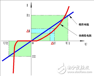 對于藍色的曲線,我們看出它是一條經過原點的直線,它的動態(tài)電阻阻值不隨著電壓和電流的變化而變化,滿足這種伏安特性曲線的元件被稱為線性元件;反之,對于紅色的曲線,我們看出它是一條曲線,它的動態(tài)電阻阻值隨著電壓和電流的變化而變化。滿足這種伏安特性曲線的元件被稱為非線性元件。