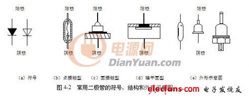圖4-2是常用二極管的符號、結(jié)構(gòu)及外形的示意圖。二極管的符號如圖4-2(a)所示。箭頭表示正向電流的方向。一般在二極管的管殼表面標(biāo)有這個(gè)符號或色點(diǎn)、色圈來表示二極管的極性,左邊實(shí)心箭頭的符號是工程上常用的符號,右邊的符號為新規(guī)定的符號。從工藝結(jié)構(gòu)來看,點(diǎn)接觸型二極管(一般為鍺管)如圖4-2(b)其特點(diǎn)是結(jié)面積小,因此結(jié)電容小,允許通過的電流也小,適用高頻電路的檢波或小電流的整流,也可用作數(shù)字電路里的開關(guān)元件;面接觸型二極管(一般為硅管)如圖4-2(c)其特點(diǎn)是結(jié)面積大,結(jié)電容大,允許通過的電流較大,適用于低頻整流;硅平面型二極管如圖4-2(d),結(jié)面積大的可用于大功率整流,結(jié)面積小的,適用于脈沖數(shù)字電路作開關(guān)管。