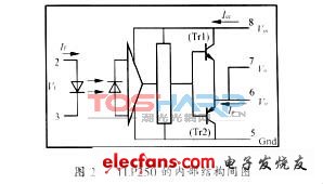 ?圖 2為 TLP250的 內(nèi) 部 結(jié) 構(gòu) 簡 圖 , 表 1給 出 了 其 工 作 時(shí) 的 真 值 表 。