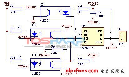 圖中我們以高速光耦6N137為例(當然只是示意圖)來說明一下隔離型RS485電路。VDD與VCC485是兩組不共地的電源,一般用隔離型的DC-DC來實現(xiàn)。通過光耦隔離來實現(xiàn)信號的隔離傳輸,ADM487與MCU系統(tǒng)不共地,完全隔離則有效的抑制了高共模電壓的產(chǎn)生,大大降低了485的損壞率,提高了系統(tǒng)的穩(wěn)定性。但也存在電路體積過大、電路繁瑣、分立器件過多、傳輸速率受光電器件限制等缺點,對整個系統(tǒng)的穩(wěn)定性也有一定的影響。