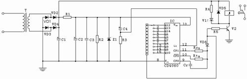 該延時(shí)電路的核心IC是由14位二進(jìn)制串行計(jì)數(shù)器/分頻器構(gòu)成,IC內(nèi)部由振蕩器和14級(jí)分頻器組成,振蕩器部分可由電阻Rt和電容Cr構(gòu)成振蕩器,產(chǎn)生固定的振蕩頻率,主振產(chǎn)生的矩形波可進(jìn)入14級(jí)分頻器,并通過10個(gè)輸出端得到不同的分頻系數(shù)(分頻最小可得到16分頻Q4,最大可得到16384分頻Q14),便可得到所需的定時(shí)控制。待分頻延時(shí)到達(dá)后,輸出端的高電平使驅(qū)動(dòng)電路三極管導(dǎo)通工作,從而使執(zhí)行繼電器工作,相應(yīng)的延時(shí)觸點(diǎn)對(duì)所需外圍線路進(jìn)行定時(shí)控制,IC振蕩也隨輸出的高電平經(jīng)V6使之停振。發(fā)光管V1也隨繼電器同時(shí)工作,起到延時(shí)到達(dá)指示。