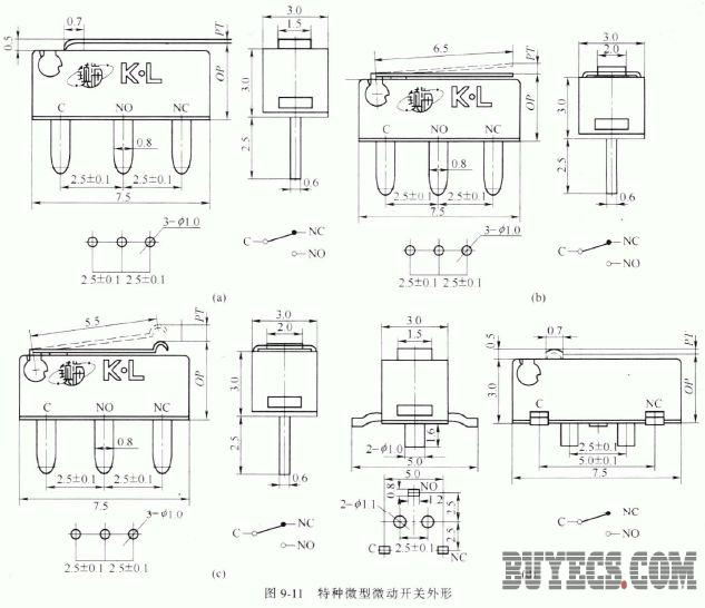 特種微型微動(dòng)開關(guān)的主要特性參數(shù)見表9-13 ,它們的外形結(jié)構(gòu)如圖9-11 所示。