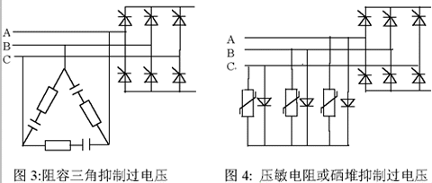 1.過電壓保護(hù)的第一種方法是并接R-C阻容吸收回路,以及用壓敏電阻或硒堆等非線性元件加以抑制。見圖3和圖4。