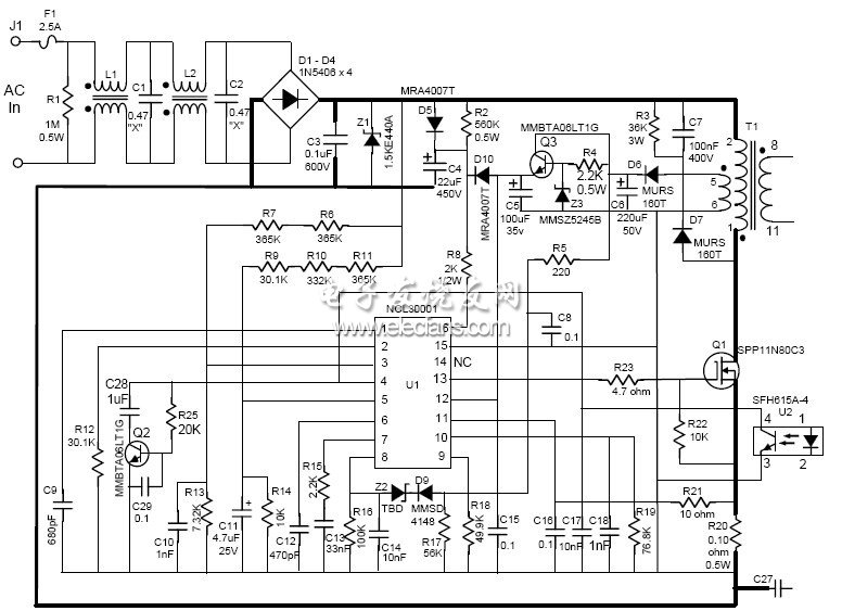 圖2:NCL30001 CVCC 90 W演示板初級側(cè)原理圖