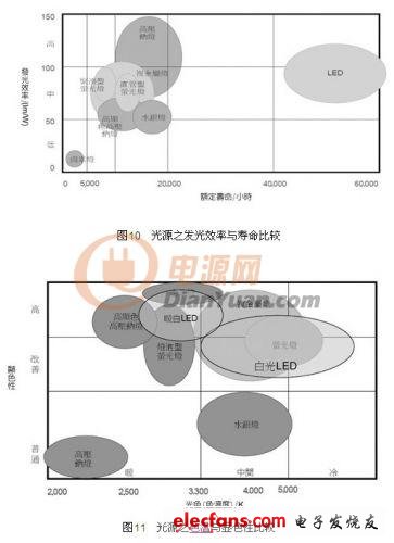 將傳統(tǒng)光源與LED光源總合作一比較,發(fā)光效率、壽命如圖10,光色與顯色性如圖11。