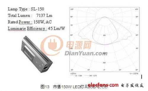 因此,以上述市售150瓦的模擬的例子來說,囿于成本考慮,僅采用發(fā)光效率每瓦58流明LED,所以在平均照度與平均輝度上,僅達(dá)到可安裝于住宅區(qū)內(nèi)的次要道路,但在照度均勻度與輝度均勻度這兩個(gè)部分,皆可符合所有道路種類與區(qū)域分類。