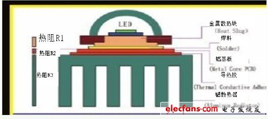 各部分的導(dǎo)熱能力也可以用系統(tǒng)的熱阻來(lái)說(shuō)明,一個(gè)LED燈具的結(jié)構(gòu)圖見(jiàn)圖9。