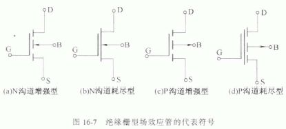 綜上所述,絕緣柵型場效應(yīng)管有四種不同的類型,即N溝道增強(qiáng)型、N溝道耗盡型、P溝道增強(qiáng)型和P 溝道耗盡型。它們的代表符號如圖16-7 所示。
