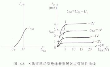 N 溝道耗盡型絕緣柵型場效應(yīng)管的特性曲線如圖16-8 所示,它基本上與N 溝道結(jié)型場效應(yīng)管的特性一致。