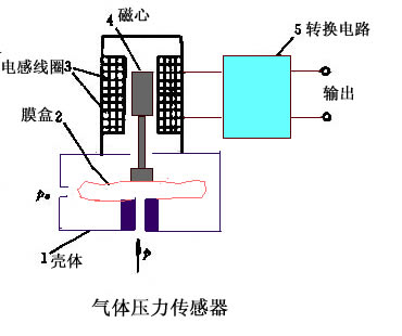 圖是一種氣體壓力傳感器示意圖。膜盒2的下半部與殼體1固接,上半部通過連桿與磁心4相連,磁心4置于兩個(gè)電感線圈3中,后者接入轉(zhuǎn)化電路5。這里膜盒就是敏感元件,其外部與大氣壓pa相通,內(nèi)部感受被測(cè)壓力p,當(dāng)p變化時(shí),引起膜盒上半部移動(dòng),即輸出相應(yīng)的位移量。可變電感3是轉(zhuǎn)化元件,它把輸入的位移量轉(zhuǎn)換成電感的變化。5即為轉(zhuǎn)換電路。