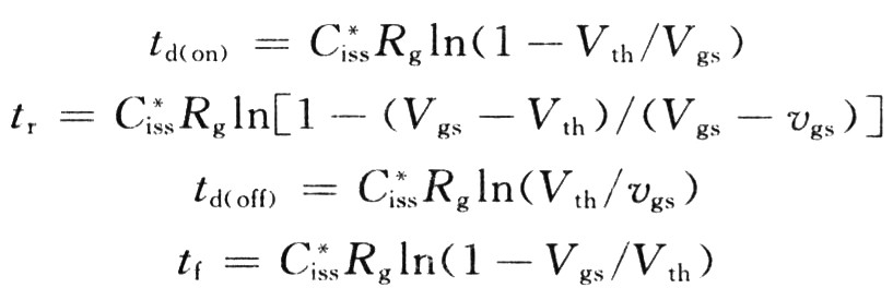 ??? VDMOS的開啟延遲時(shí)間td(on)、上升時(shí)間tr、關(guān)斷延遲時(shí)間td(off)、下降時(shí)間tf的關(guān)系式可分別表達(dá)為: