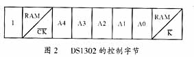 2.2 DS1302的控制字節(jié) ????DS1302 的控制字如圖2所示??刂谱止?jié)的最高有效位(位7)必須是邏輯1,如果它為0,則不能把數(shù)據(jù)寫入DS1302中,位6如果為0,則表示存取日歷時鐘數(shù)據(jù),為1表示存取RAM數(shù)據(jù);位5至位1指示操作單元的地址;最低有效位(位0)如為0表示要進(jìn)行寫操作,為1表示進(jìn)行讀操作,控制字節(jié)總是從最低位開始輸出。