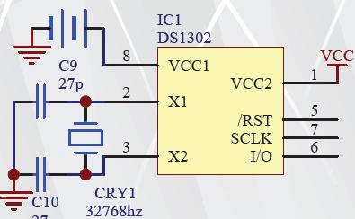 ds1302引腳功能及結(jié)構(gòu) ????圖1示出DS1302的引腳排列,其中Vcc1為后備電源,VCC2為主電源。在主電源關(guān)閉的情況下,也能保持時鐘的連續(xù)運行。DS1302由Vcc1或Vcc2兩者中的較大者供電。當(dāng)Vcc2大于Vcc1+0.2V時,Vcc2給DS1302供電。當(dāng)Vcc2小于Vcc1時,DS1302由Vcc1供電。X1和X2是振蕩源,外接32.768kHz晶振。RST是復(fù)位/片選線,通過把RST輸入驅(qū)動置高電平來啟動所有的數(shù)據(jù)傳送。RST輸入有兩種功能:首先,RST接通控制邏輯,允許地址/命令序列送入移位寄存器;其次,RST提供終止單字節(jié)或多字節(jié)數(shù)據(jù)的傳送手段。當(dāng)RST為高電平時,所有的數(shù)據(jù)傳送被初始化,允許對DS1302進(jìn)行操作。如果在傳送過程中RST置為低電平,則會終止此次數(shù)據(jù)傳送,I/O引腳變?yōu)楦咦钁B(tài)。上電運行時,在Vcc≥2.5V之前,RST必須保持低電平。只有在SCLK為低電平時,才能將RST置為高電平。I/O為串行數(shù)據(jù)輸入輸出端(雙向),后面有詳細(xì)說明。SCLK始終是輸入端。