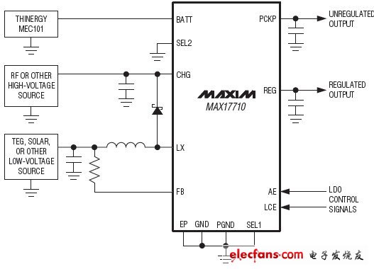 MAX17710是一個(gè)用于充電和保護(hù)微存儲(chǔ)單元的完整體系。 該IC可管理不規(guī)范,如能源采伐,輸出范圍從1μW到100mW的水平裝置的來(lái)源。 該器件還包??括一個(gè)從源收取高達(dá)0.75V(典型值)低電池升壓穩(wěn)壓器電路。 內(nèi)部穩(wěn)壓器可保護(hù)細(xì)胞過度充電。